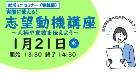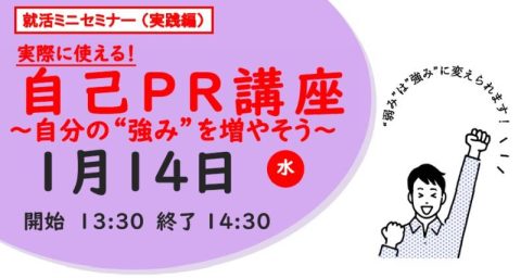 セミナー・イベント 全て 求職中の方 学生の方 在職中の方 企業の方 全て 2025年12月 在職中の方学生の方求職中の方 【由利本荘市】職業適性診断inハローワーク本荘 2025年12月09日 10:45〜15:30 続きを読む 在職中の方学生の方求職中の方 【秋田市】職業適性診断 2025年12月25日 10:00〜15:45 続きを読む 2026年01月 求職中の方 【秋田市】就活ミニセミナー (実践編 )「自己PR講座」~自分の″強み…… 2026年01月14日 13:30〜14:30 続きを読む 求職中の方 【秋田市】就活ミニセミナー(実践編)「志望動機講座」~人柄や意欲を伝え…… 2026年01月21日 13:30〜14:30 続きを読む 2026年02月